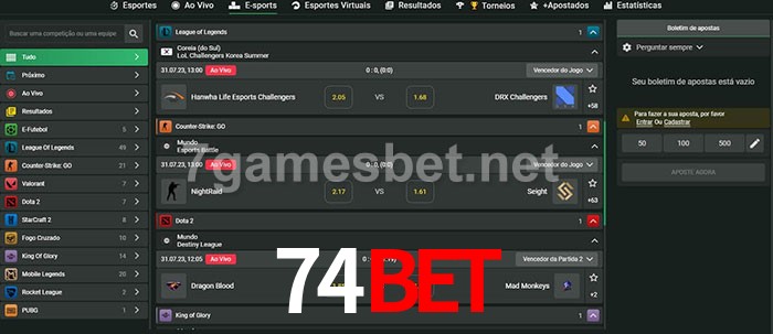O 74bet oferece uma grande seleção de opções de apostas em e-sports com probabilidades competitivas